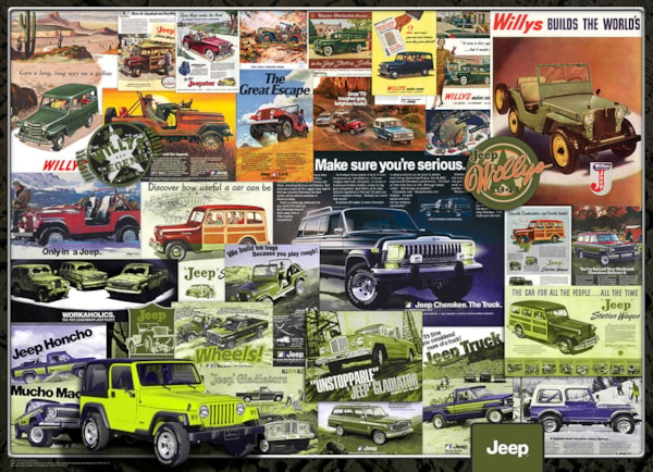 - Fun on and off the open road, Jeep has provided an exhilarating option to explore anywhere your heart takes you. From the Wrangler to the Jeep Grand Cherokee, Jeep is known for driving fun. This 1000 piece puzzle shows the complete history of an iconic automobile line.