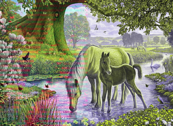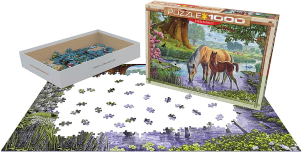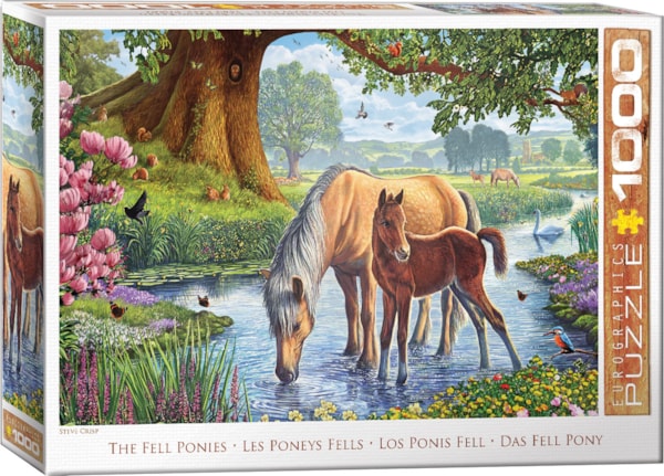 This enchanting 1000-piece Eurographics puzzle, titled "The Fell Ponies," transports you to a serene and vibrant natural setting. The exquisite artwork by Steve Crisp features a beautiful mare and her foal gracefully drinking from a clear stream, surrounded by lush foliage, colorful wildflowers, and a variety of charming wildlife including butterflies, birds, and squirrels. In the background, rolling hills and more horses complete this idyllic pastoral scene.