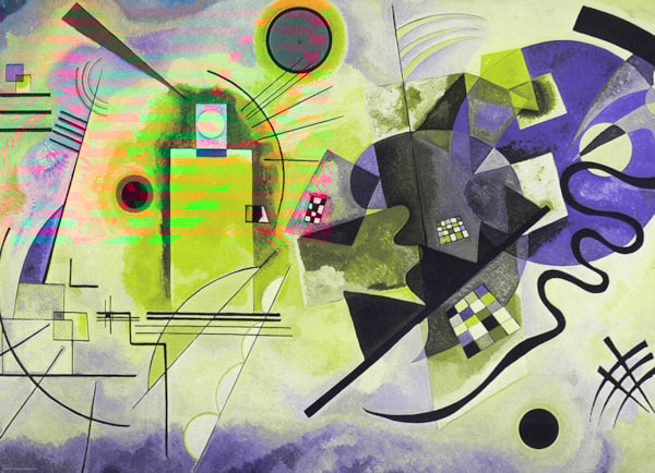 - Yellow, red, blue was created in 1925 while Kandinsky was teaching desing and painting classes. Geometrical elements took on increasing importance in his painting, particularly the circle, half-circle, the angle, straight lines and curves.