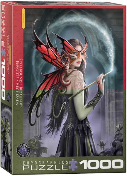 This captivating 1000-piece Eurographics puzzle from the Anne Stokes Collection, titled "Spellbound," whisks you away to an enchanted realm of magic and mystery. The stunning artwork features a beautiful, winged fairy-like figure, adorned with an intricate mask and elegant red and black attire, holding a glowing wand that emits ethereal light. A small, watchful dragon perches on her shoulder, while thorny roses bloom in the foreground.