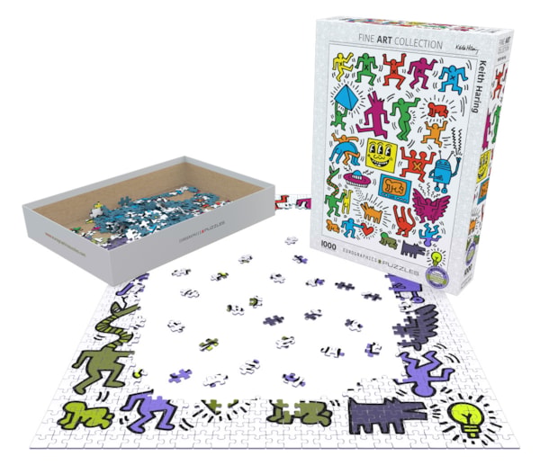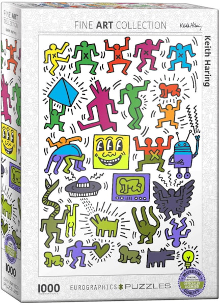 Dive into the vibrant world of pop art with this 1000-piece puzzle featuring the iconic work of Keith Haring. He developed a love for drawing at a very early age, learning basic cartooning skills from his father and from the popular culture around him, such as Dr. Seuss and Walt Disney.