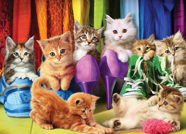 This adorable 1000-piece Eurographics puzzle, "Kitten Pride" by Audree Fenley, is a heartwarming celebration of playful feline charm. The vibrant image features a delightful group of fluffy kittens, with various fur patterns and bright eyes, playfully nestled amongst colorful shoes and a rainbow of fabric swags in the background. From kittens peeking out of sneakers to others lounging on high heels or tangled in yarn, each one exudes irresistible cuteness.