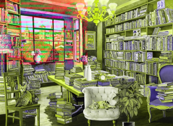 An amazing collection of books decorate an old library room, while two cats lie restless awaiting a visitor.