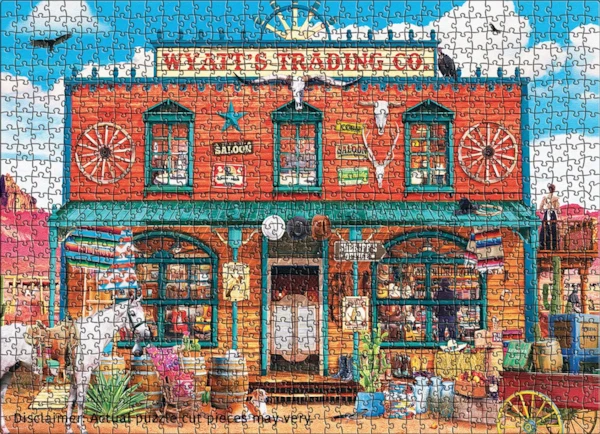 Saddle up for a trip to the Wild West! Wyatt’s Trading Co. by artist Leann Kate is a story-packed puzzle set in a colorful frontier general store—complete with saloon doors, a sheriff’s office, wagon wheels, cacti, textiles, a loyal horse and pup, and stacks of curious goods to discover in every section. Bright details and warm desert hues make this a joy to build and a standout to display.