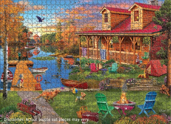Escape to cottage country every time you open this 1000-piece jigsaw. Adventures at the Lake captures a golden autumn day by a log cabin, where brightly painted Adirondack chairs circle a crackling campfire, towels dry on the porch railing, and canoes and rowboats wait at the dock. Playful dogs splash at the shoreline while children paddle across the glass-calm water under a sky filled with birds and sunset clouds.