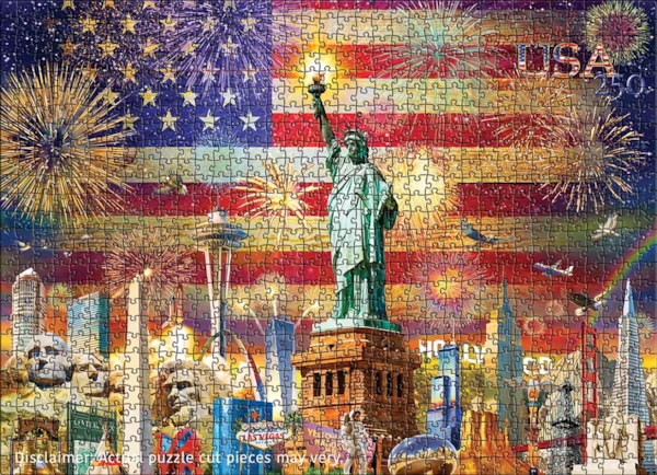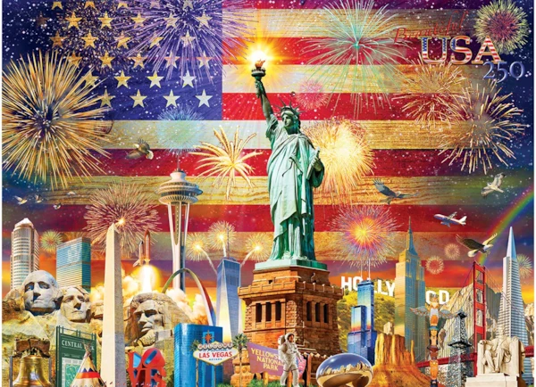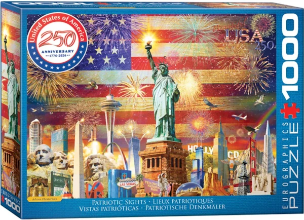 Celebrate a milestone in history with Patriotic Sights, a stunning 1000-piece puzzle honoring the 250th Anniversary of the United States of America (1776–2026). This vibrant collage brings together the nation’s most iconic landmarks and symbols—from the Statue of Liberty and Mount Rushmore to the Golden Gate Bridge, the Space Needle, and beyond—set against a dazzling American flag illuminated by fireworks.
