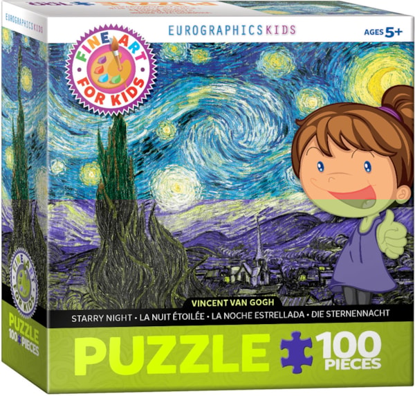 Explore a masterpiece with the Eurographics Vincent van Gogh "Starry Night" 100-piece puzzle. This captivating jigsaw puzzle faithfully recreates Van Gogh's iconic artwork, showcasing its distinctive swirling blue skies, brilliant luminous stars, and a dramatic cypress tree.