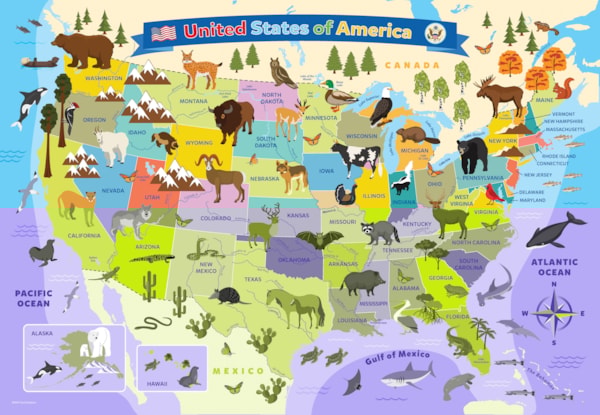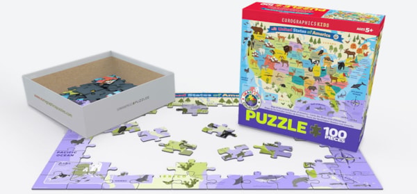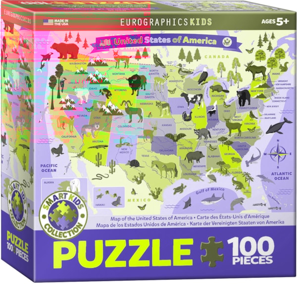 Unveil the diverse landscape and wildlife of the United States of America with this engaging 100-piece puzzle. Piece together the map to reveal the different states, from the Pacific coast to the Atlantic shore, and discover the amazing animals that call each region home.
