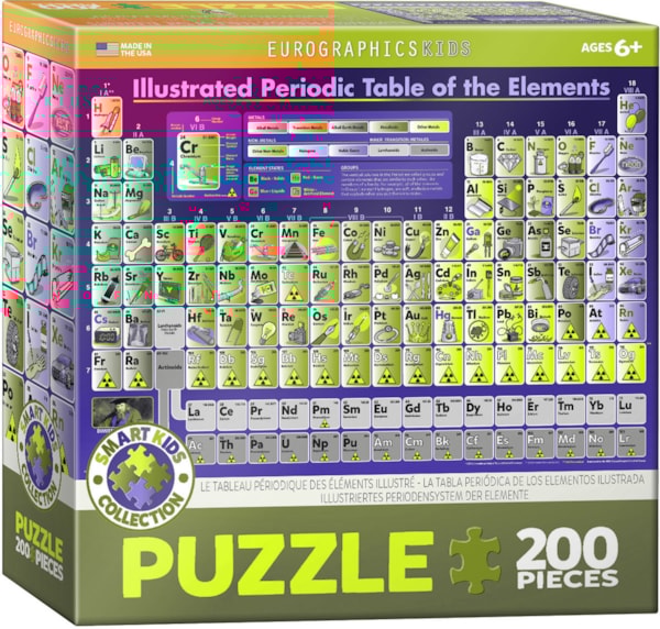 Explore the world of science with the Eurographics "Illustrated Periodic Table of the Elements" puzzle. This 200-piece puzzle, designed for ages 6 and up, features a colorful and informative illustrated periodic table. Each element is represented by a unique image, making it easy to learn about different elements. It's a fun and educational activity for young and old alike, and is part of the "Smart Kids Collection".