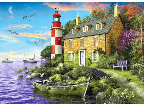 Escape to a serene coastal retreat with "The Cottage Lighthouse," a captivating 104-piece puzzle from the Eurographics Connecting Pieces Collection. Illustrated by the talented Dominic Davison, this charming puzzle brings to life a peaceful stone cottage nestled by a red-and-white lighthouse, surrounded by blooming gardens and the calming sea. Perfect for puzzle enthusiasts of all ages, the scene evokes relaxation and a longing for quiet moments by the coast. With extra-thick, easy-to-handle pieces, this puzzle provides an enjoyable experience for the whole family. Complete your journey with the full image printed inside the box lid, designed to guide your assembly.