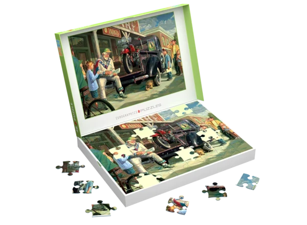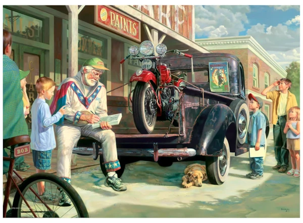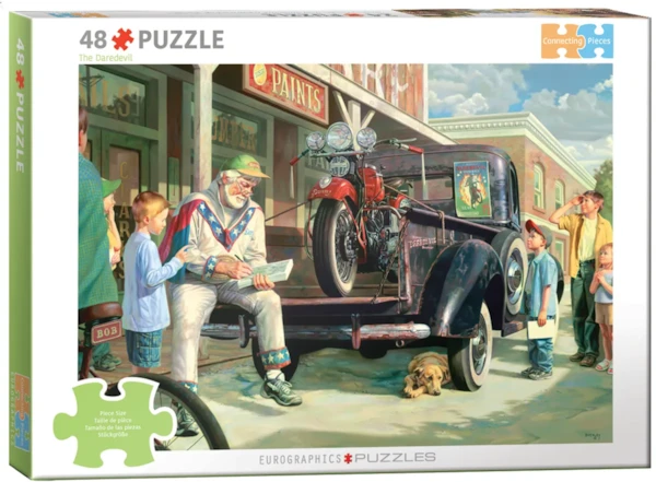 Rev up the nostalgia with this heartwarming scene of a retired stunt rider, his vintage red motorcycle, and star-struck kids in a small-town street. Extra-thick, easy-grip pieces support focus, dexterity, and confidence—perfect for cognitive engagement and gentle brain exercise. The full image is printed inside the box lid for reference, and the finished puzzle can be stored right in the box. A meaningful activity for families, classrooms, and therapy settings.