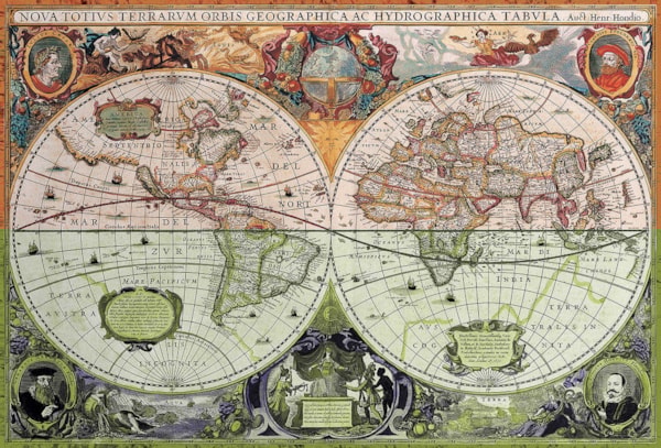 - This beautiful antique map is very decorative and features a beautiful rendering of the world as seen in history.