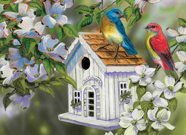 Down the road and over the hill, there's a cabin that the birds call home, specially this eastern bluebird and its companion. With their bright colors and happy songs, this beautiful scene evokes feelings of friendship and sunshine.