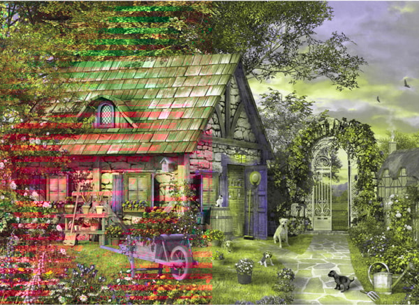 An attractive puzzle scene image of cobblestone shed, gardening tools, flowers and wildlife.