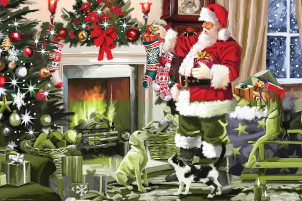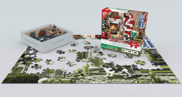 Celebrate the warmth of the holidays with Santa’s Best Friend, a festive 300-piece puzzle from Eurographics. Set in a cozy living room aglow with firelight, this heartwarming scene features Santa Claus filling stockings as two loyal pets look on with joy.