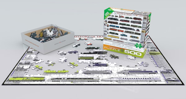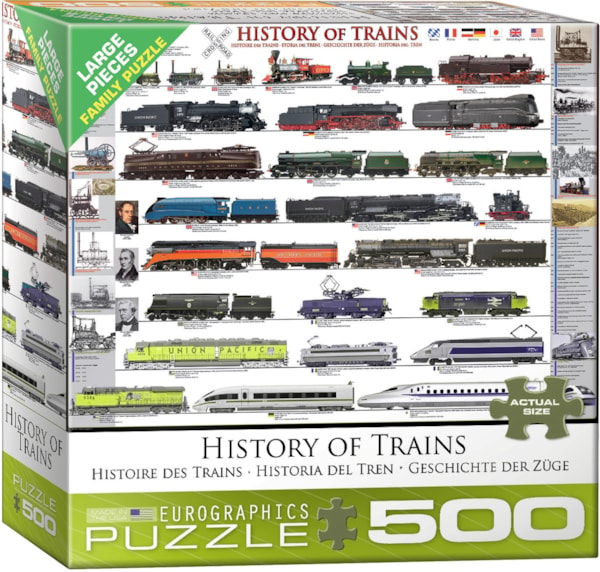 Travel through time with History of Trains, a fascinating 500-piece puzzle from Eurographics. Featuring detailed illustrations of iconic locomotives from the 1800s to modern high-speed trains, this educational puzzle highlights rail innovations across countries like the UK, USA, France, Germany, and Japan.