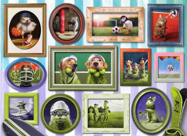 Get ready for a sporty dose of fun with World of Sports, a 500-piece puzzle from Eurographics. This lively and humorous collection of animal portraits features dogs, cats, mice, and more showing off their athletic skills in a variety of sports—from surfing and soccer to weightlifting and golf. Bursting with color, personality, and playful details, this puzzle is sure to bring smiles to the whole family.
