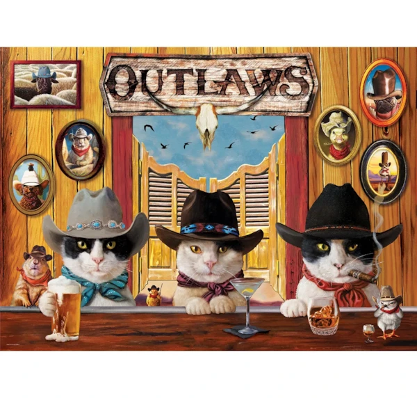 Sidle up to the Saloon where three dapper cow-cats hold court—frothy beer, martini, whisky on the rocks and even a tiny sheriff bird raise the laughs. Wood-paneled walls, swinging doors, old-west portraits and a cheeky “Outlaws” sign make this a purr-featly funny scene with loads of details to spot.