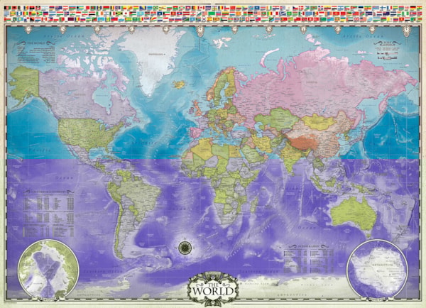 - Une carte magnifiquement rendue du monde, y compris des données complètes sur la population et la zone, plus les caractéristiques politiques et géologiques.