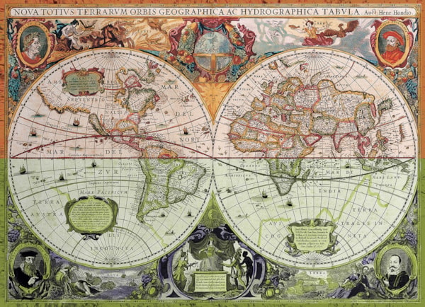 - Cette carte a été publié dans l'Atlas Mercator-Hondius dans la 1630 édition, en réponse à Willem Blaeu. Portraits de Jules César, Ptolémée, Mercator et Hondius ornent les bordures décoratives. Il dispose d'une apparition précoce de la côte nord de l'Australie. Reknown pour être l'une des plus belles cartes du monde de l'époque.