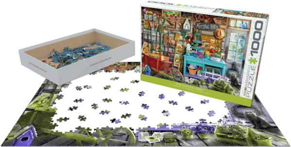 Ce charmant casse-tête de 1000 pièces Eurographics, "Le Cabanon", vous invite dans le havre de paix d'un jardinier organisé et attachant. L'image détaillée représente un cabanon en bois rustique rempli d'une panoplie d'outils de jardinage, de pots de fleurs colorés, de paquets de graines et de divers trésors horticoles. Une table de rempotage bleue vibrante occupe le centre, chargée de plantes en fleurs, tandis qu'un chat curieux observe patiemment depuis l'entrée.