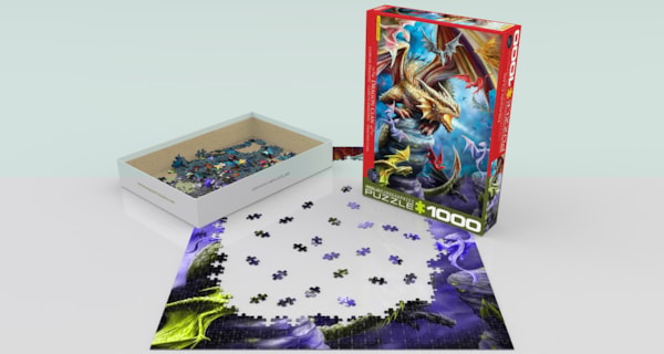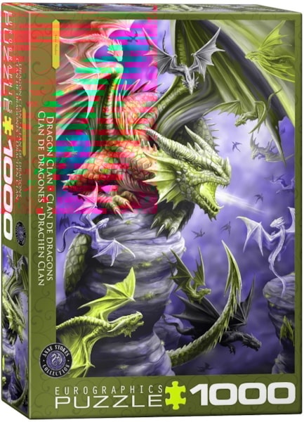 Ce casse-tête épique de 1000 pièces Eurographics, "Clan de Dragons" de la collection Anne Stokes, vous transporte dans un monde fantastique grouillant de bêtes mythiques. Le puissant dragon central, avec ses ailes magnifiques et son souffle ardent, attire l'attention du haut d'un pic escarpé. L'entourent une multitude vibrante de dragons plus petits dans diverses poses et couleurs, planant à travers un ciel bleu dramatique.