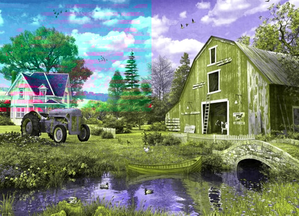 Ce captivant casse-tête de 1000 pièces Eurographics, "La Grange Rouge" de Dominic Davison, capture un paysage rural typique débordant de charme. L'image vibrante présente une impressionnante grange rouge, sa couleur magnifiquement reflétée dans l'étang serein au premier plan, où des canards glissent gracieusement. Une charmante ferme blanche se dresse à proximité, complétée par un tracteur vert classique, un pont de pierre et un feuillage luxuriant et coloré sous un ciel lumineux et nuageux.