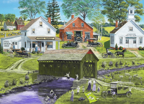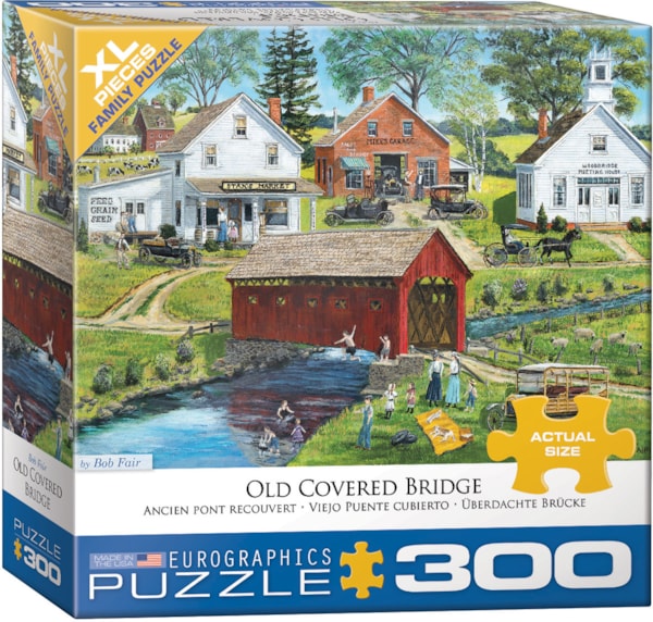 Plongez dans le charme d’autrefois avec Ancien pont couvert, un casse-tête de 300 morceaux magnifiquement illustré par Eurographics. La scène dépeint un village rural paisible avec un pont couvert rouge, des voitures d’époque, des calèches et des familles profitant d’une journée d’été. L’œuvre nostalgique de Bob Fair fait revivre la vie du début du 20e siècle avec réalisme.
