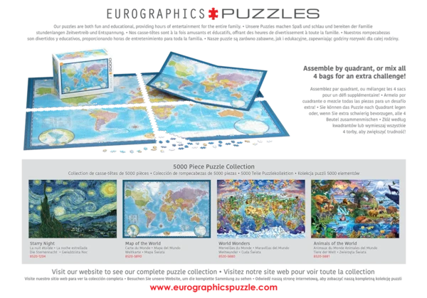 - Le puzzle est livré dans 4 sacs séparés (1250 pièces chacun), qui composent chaque quadrant du puzzle. Assemblez par quadrant ou mélangez les 4 sacs pour un défi supplémentaire.
