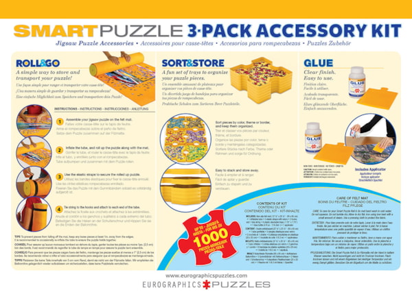 Le coffret d’accessoires Smart Puzzle 3-en-1 est la solution idéale pour une expérience de casse-tête bien organisée et agréable. Cet ensemble tout-en-un comprend un tapis de puzzle à rouler pour un rangement et un transport faciles, des plateaux empilables pour trier vos pièces par couleur ou par forme, ainsi qu’un tube de colle avec applicateur pour conserver votre œuvre terminée.
