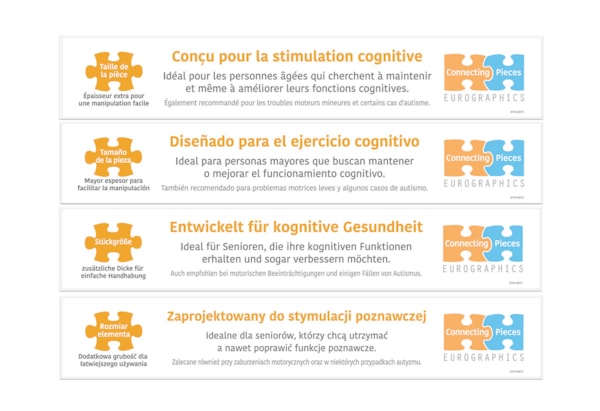 Connecting Pieces est une collection de puzzles soigneusement conçue pour promouvoir une activité qui stimulera le cerveau, améliorera la motricité et l'interaction sociale, faisant du puzzle une activité parfaite pour tous les âges.
